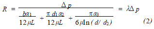 1) 通過活塞環(huán)本身切口h1 處的泄漏。該泄漏可視為平行平面間的縫隙流動。在層流狀態(tài)下, 流量與壓力之間的關系為QV1 = bh13 Δp/12μL 。定義此處的流阻[6 ] R1 = Δp/ QV1 = 12μL/bh13 。式中: QV 為體積流量; b 為縫隙流道的寬度, b = d1 - d2/2 ; h1 為活塞環(huán)切口寬度;Δp 為切口兩端的壓差;μ為水的粘度; L 為活塞環(huán)高; d2 、 d1 分別為活塞環(huán)的內、外直徑。