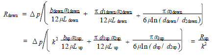水壓缸兩端密封為兩個并聯的流阻,且其結構參數間存在著線性比例關系, 比例因子 k = 0. 733 。由于水壓缸單端密封的流阻主要集中在3 道活塞環(huán)上,因此,取其中1 道活塞環(huán)為研究對象,下標“up”表示水壓缸上端活塞環(huán)密封,下標“down”表示水壓缸下端活塞環(huán)密封, 則由式(2) 可知: