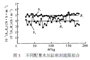 在控制棒水壓驅動機構單缸步進性能實驗[7 ] 中,從開始充壓到水壓缸內套動作這一段時間定義為步升前充壓時間,在此段時間內,由于水壓缸內套未動作,回路中入缸流量等于泄漏流量,利用不同配重步升過程中的實驗數據即可求出水壓缸活塞環(huán)密封的泄漏流阻。用最小二乘法來擬合不同配重步升前充壓時間內的( R ,Δp) , 自變量為Δp , 函數為R = Δp/QV ,求出各個配重下的流阻擬合公式, 即不同配重實驗所對應的b0 和b1 值, 擬合結果示于圖5 , 其中, M 為配重??梢钥闯?對幾何結構一定的活塞環(huán)密封結構而言,不同配重實驗所對應的b0 和b1 值基本不變。取它們的平均值, B0 和B1 為計算公式中的系數。